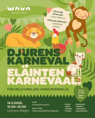 12.02.2026 18:00 Mitalijuhla 2025 Schauman Hall 14.02.2026 15:00 - 18:00 Eläinten Karnevaali Campus Allegro 18.02.2026 18:30 - 20:00 Vårkänslor och trädgårdsmagi med Karl Fredrik på Österlen Schauman Hall 19.02.2026 18:00 Allsång i Jeppis Schauman Hall 21.02.2026 19:00 Hurri ja Tosi Hurri suomeksi Schauman Hall 21.02.2026 16:00 Hurri ja Tosi Hurri på svenska Schauman Hall 04.03.2026 19:00 Arctic Pulse Orchestra Schauman Hall 06.03.2026 20:00 - Albin & Arvid Schauman Hall 07.03.2026 18:00 Legendernas nostalgikväll 2026 Schauman Hall 20.03.2026 18:30 - 20:30 Stand up i Schaumansalen Schauman Hall