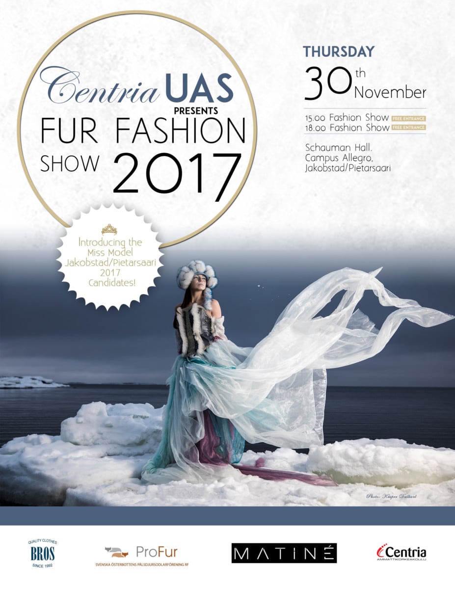 Centria Ammattikorkeakoulun liiketalouden opiskelijat järjestävät muotinäytökset jossa esitellään Centrian turkisalanopiskelijoiden luomuksia. Yhteistyössä Mallitoimisto Matine´n kanssa. Muotinäytöksen malleina toimivat Miss Model Jakobstad – Pietarsaari kilpailun kandidaatit.